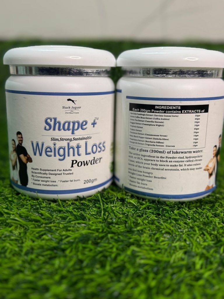Weight Loss Powder – Shape+™️Slim, Strong, SustainableIngredients: • Garcinia Cambogia Extract (Garcinia Gummi Gutta) • Green Coffee Bean Extract (Coffea Arabica) • Green Tea Extract (Camellia Sinensis) • Guggul Extract (Commiphora Wightii) • Triphala Extract • Trikatu Extract • Cinnamon Extract (Cinnamomum Verum) • False Black Pepper Extract (Embelia Ribes) • Punarnava Extract (Boerhavia Diffusa) • Fenugreek Extract (Trigonella Foenum-Graecum)⸻Benefits: ✅ Faster weight loss ✅ Faster fat burn ✅ Boosts metabolism ❌ Not for medicinal use⸻Dosage: ➡️ 1 Spoon in the Morning ➡️ 1 Spoon in the Evening⸻Product Highlights: • No Side Effects • Food Supplement Product • 100% Natural • No Sugar Added⸻Packaging: 200 gm container⸻Marketed by: Black Jaguar Exim B/328, Shlok Infinity, Near Chandlodiya Road, Opp. Shaligram Plus, Chandlodiya, Ahmedabad – 382481For Feedback/Queries Contact: 📧 Email: info@blackjaguarglobal.in⸻Certifications: ✔️ ISO Certified ✔️ GMP Certified ✔️ Kosher Certified ✔️ FSSAI Approved ✔️ Export Quality Standards